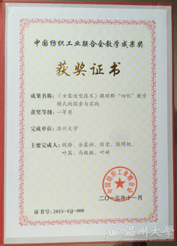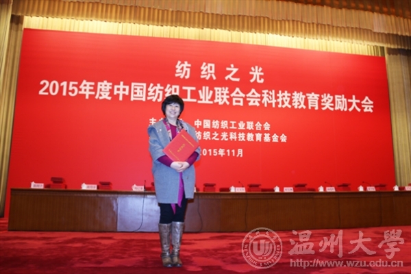 2015年11月24日,“纺织之光”2015年度中国纺织工业联合会科技教育奖励大会在北京人民大会堂隆重举行。中国纺织工业联合会、各专业协会领导,地方行业协会领导,纺织之光科技教育基金会理事以及本次会议表彰的科技工作者、企业家、院校教师与学生获奖代表及媒体嘉宾600余人出席了大会。我院魏静教授应邀出席了会议。 纺织之光2015年度中国纺织工业联合会表彰了科学技术奖、教育教学成果奖、教师特别奖、学生特别奖、创新奖、行业技术能手荣誉称号、行业技能人才培育突出贡献单位及个人。充分体现了中纺联对纺织行业科技教育工作的高度重视和对广大科技工作者、教育工作者、学生和一线技术工人的亲切关怀。希望全行业广大员工以获奖者为榜样,带动全行业创新创业的热潮,在攻坚克难中追求卓越,为建设纺织强国作出新的更大贡献。 我院魏静教授主持的《女装造型技术》课程群“四化”教学模式的探索与实践荣获2015纺织之光教学成果一等奖;陈明艳教授主持的依托区域产业的服装设计与工程专业卓越工程师人才培养模式的改革荣获二等奖。