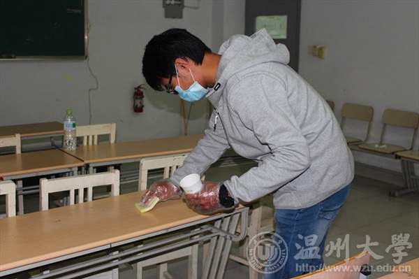 2015年12月6日下午,为了提高同学们保护公共环境的意识,我院“艺家人”青年志愿者协会联合校文明督察队在美院教学楼内开展了以“拒绝课桌文化”为主题的清洁课桌桌面的活动。 为确保大家的安全,校文督的陈镜宇同学带来了口罩以及所需要的清洁用品,并且组织大家进行了简单的分组。小分队在各自的队长的带领下,前往各个教室进行“桌面复原”工作。整个活动期间,志愿者们表现的都十分积极。 此次活动不仅是把桌面打扫的干干净净,更重要的是提高同学们保护公共环境的意识,为学校,为自己构建一个美好的学习环境。 文字:王烨 拍摄:王烨