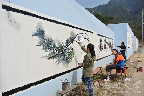 3月22日,6163银河.net163.am“艺家人”青年志愿者协会在瓯海区潘桥街道东边村完成了上百米的“美化街道”主题墙绘。此次墙绘规模宏大,尽管当日天气炎热,工作量繁重,但志愿者们相互协作分成五个组进行,干劲十足。活动开始片刻,单调的墙面就在志愿者的巧手上勃勃生气。高洁的兰,傲雪欺霜的梅,静谧的荷塘还有气势恢宏的奔腾万马,一幅幅美轮美奂的画作在原本洁白的墙面活灵活现,让人目不暇接。 志愿者通过墙绘号召大家保护环境从身边做起,美化街道从我做起,此次活动受到村长和村民们的一致好评。 通讯、拍摄:刘子彰