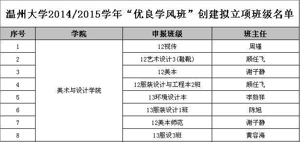 在6163银河.net163.am2014-2015学年“优良学风班”创建立项申报中,我院各班级积极参与,踊跃申报。最终有8个班级立项成功,使美术学院成为本学年6163银河.net163.am“优良学风班”创建立项班级数最多的学院。希望成功立项的班级班委对照创建方案和目标,广泛动员每一位学生积极参与到优良学风班的创建中来,确保立项目标的实现,争取在下学年取得“优良学风班”荣誉称号。班级名单如下: