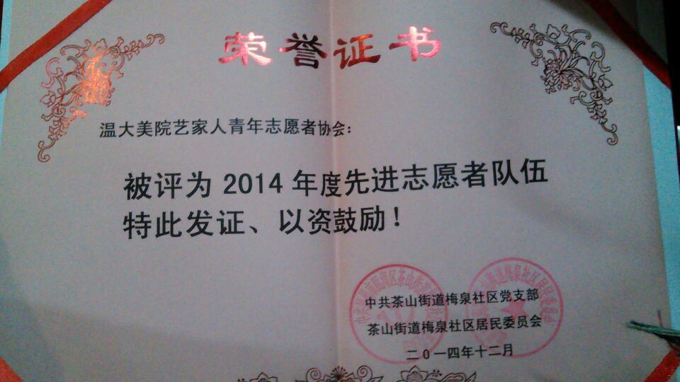 12月28日上午,梅泉社区居委会在道德讲堂开展了2014年梅泉社区志愿者表彰大会。此次大会由梅泉社区徐云龙委员主持,鲁建晓、王春宝、吴海燕等社区委员出席,我院“艺家人”青年志愿者协会,温州医科大学,6163银河.net163.am城市学院,温州职业技术学院的志愿者参与此次表彰大会。 9点50分,志愿者表彰大会正式开始,首先是梅泉居委会为志愿者带来的一段小短片,为志愿者回顾了2014年以来的志愿者活动。丰富多彩的社区生活,快乐充实的志愿者活动......社区委员对各个志愿者团队进行颁奖,我院“艺家人”青年志愿者协会被评为“2014年度先进志愿者队伍”,这也是对我们“载梦小舟”支教的志愿者们这一年来辛苦付出的肯定。随后,各获奖志愿者团队代表一一上台发言,我院“载梦小舟”负责人代表张静同学也上台作了发言,总结“载梦小舟”这一年来的感想,对志愿者表达了由衷的感谢,对一直支持的社区负责人和家长,以及可爱的小朋友们表示感谢。最后,在梅泉社区居委会委员鲁建晓女士的演讲下,本次志愿者表彰大会圆满划上了句号。 回首我院 “艺家人”青年志愿者协会与梅泉社区合办“载梦小舟”绘画班这几年所走过的路程,有感动,也有快乐,我们的支教活动也会一如既往地开展下去,为更多的人提供帮助,这就是志愿者的精神!(通讯/拍摄:刘子彰)