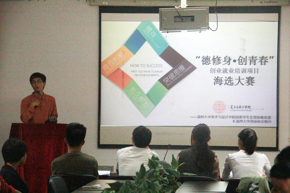 10月18日下午,我院团委学生会创业就业部和校创业学院创业协会联办的“德修身&创青春”创业就业培训项目的海选大赛在2B4001拉开序幕。团委副书记金李斌,创业就业部副部长张昇、胡霜霜,研究生代表李艳燕、张娜,共同担任了此次大赛的评委。来自学校不同年级的同学参加了本次海选。
