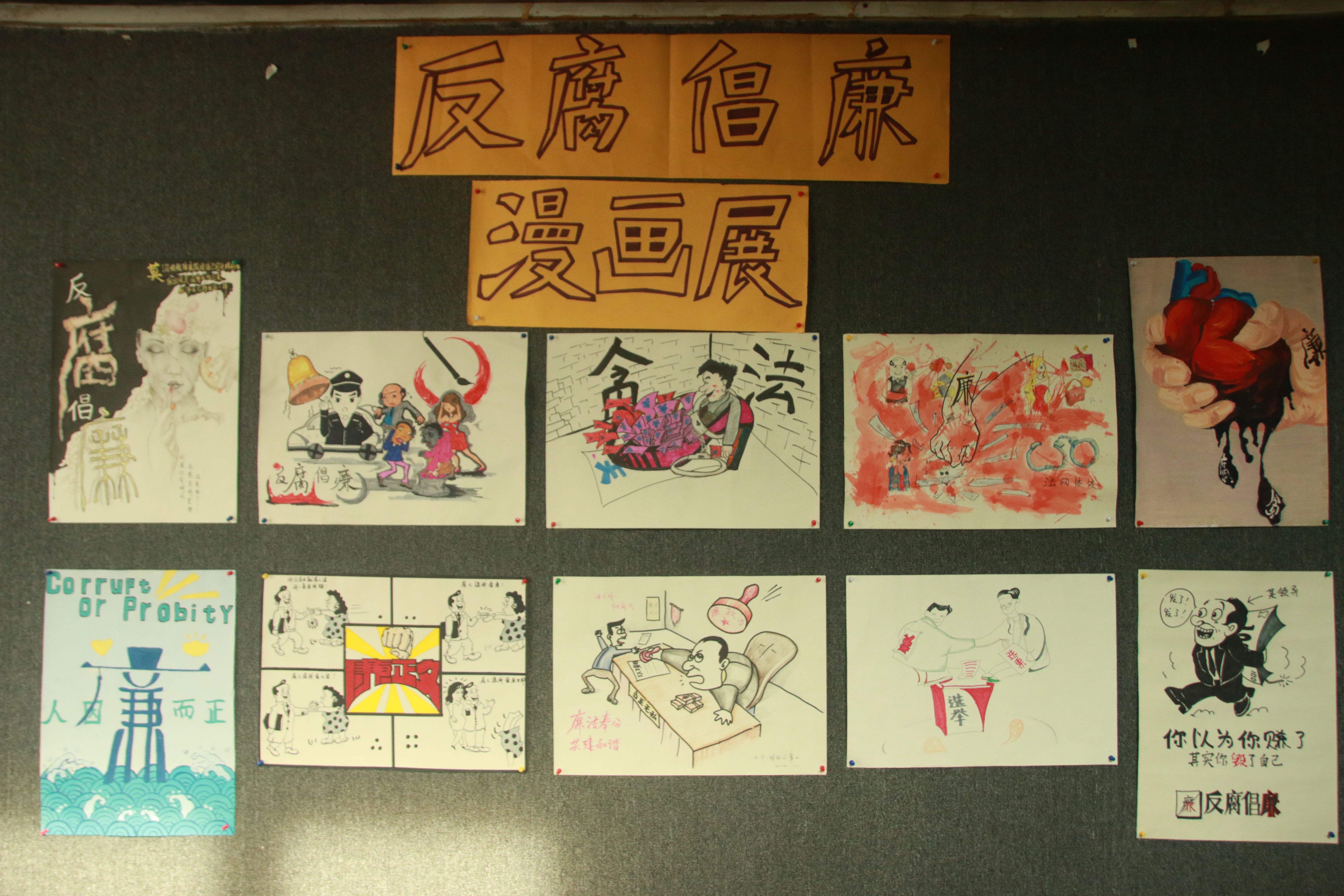 为了营造良好的校园风气,展现当代大学生的文艺术才华。10月15日至10月28日,由我院开展了主题为“反腐倡廉手中画,树文明新风尚”的反腐倡廉宣传漫画比赛。本次比赛由校纪委与我院联合主办,院学生会设计宣传部承办。 活动历时13天时间,得到了许多同学的积极参与,同时也征集到了很多优秀作品。风趣幽默的简笔画、情节详细的几格漫画,参赛者纷纷发挥着自己独特的想法和自身的美术功底,将一幅幅精美的漫画呈现在我们面前,展示了作为新一代大学生的朝气与活力。作品展出后得到了老师和同学们驻足观看,赢得了大家的好评。 此次“反腐倡廉”漫画比赛,可以更好地营造社会风气,树立崇高的理想,端正自己的做事态度,明确自己的人生方向。从而达到活动所想要的效果和目的,并且能丰富同学们的课余生活,提高学生的艺术素质,促进学生全面发展。