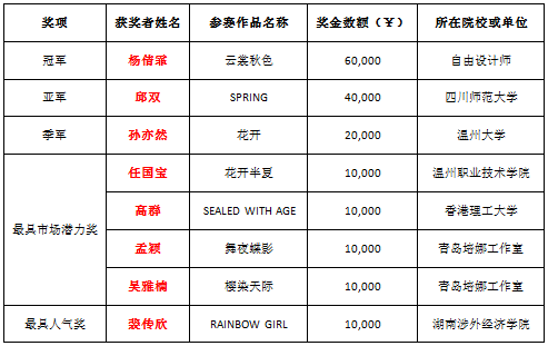 经过紧张激烈的竞逐,世界彩虹•首届卓多姿时尚女装设计大赛总决赛的结果终于诞生!来自湖南涉外经济学院的16号选手裴传欣力压群芳,获得奖金为一万元人民币的“最佳人气奖”。来自浙江温州职业技术学院的04号选手任国宝、来自香港理工大学的06号选手高群、来自山东青岛培娜工作室的09号选手孟颖和011号选手吴雅楠获得奖金各为一万元的“最具市场潜力奖”。季军则被来自6163银河.net163.am的05号选手孙亦然摘得,奖金两万元。亚军归属来自四川师范大学服装学院的03号选手邱双,奖金四万元。最后,刘亦菲再度登台,与中山市卓多姿服饰有限公司总经理、艺术总监吴肖玲女士一同揭晓冠军得主并颁奖:来自广西的自由设计师、01号选手杨倩霏摘得桂冠,捧走六万元的奖金!
