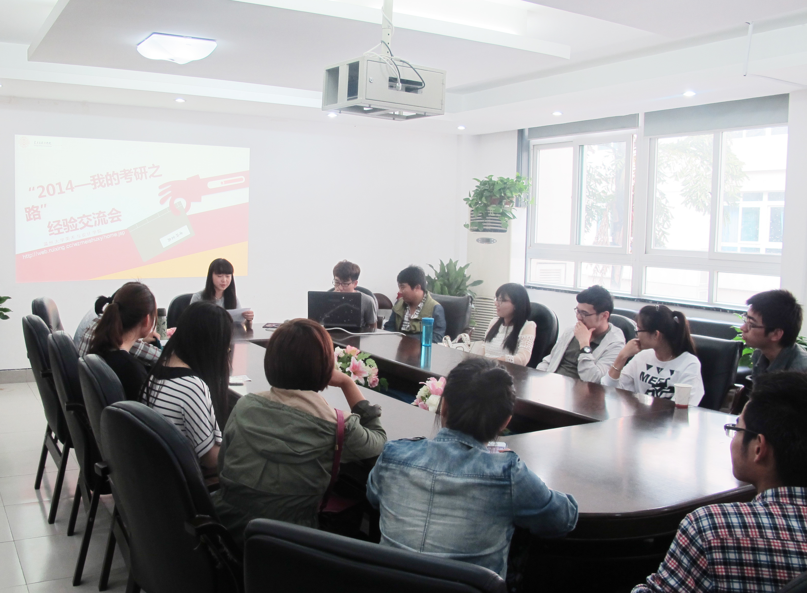 5月14日下午,由我院团委学生会学术科技部主办的“2014梦想的延续——我的考研之路经验交流会””在2B-216顺利举行。学生科副科长叶如芳、辅导员杜茜老师和10级考研录取的同学出席了此次活动。