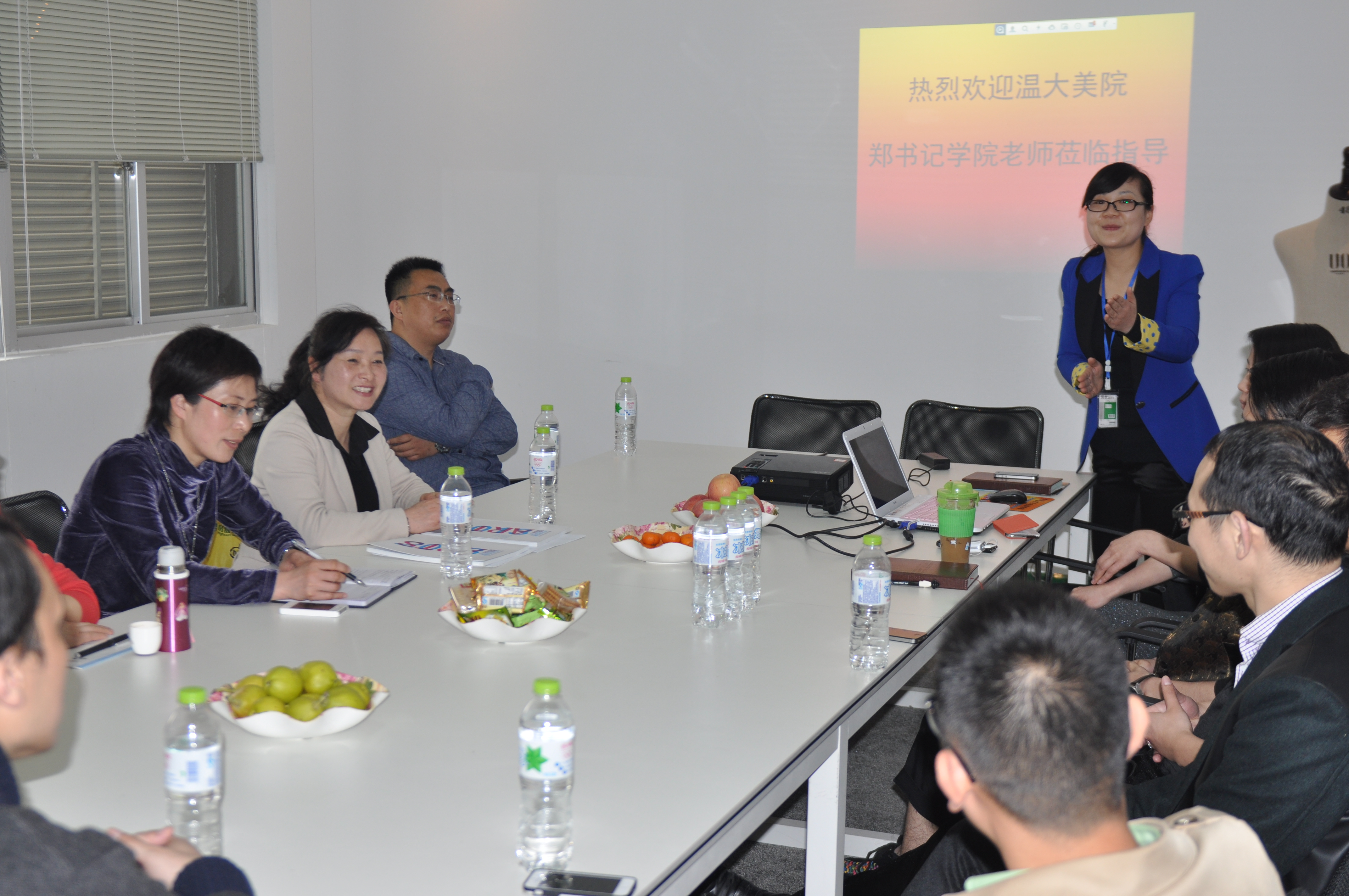 参观后,郑书记、陈主任及各位老师与公司董事长叶剑勇、总经理金上尧以及人力资源部、营销部、设计研发部的负责人进行了座谈交流。会上,人力资源部负责人分别就公司的发展历程、品牌文化、产品定位及管理模式做了详细介绍,与会人员还就具体合作项目的内容、方式等方面进行了广泛深入的交流,会场气氛热情、轻松、愉快。