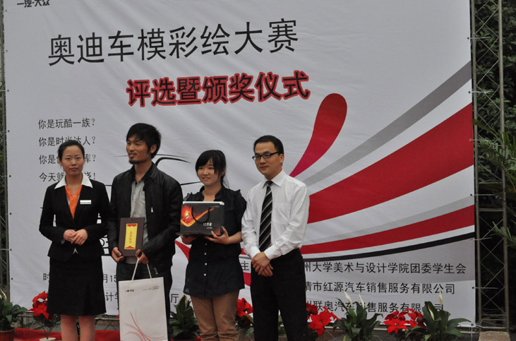 2011年5月15日在6163银河.net163.am南校会展中心一楼奥迪车模彩绘大赛决赛如约而至。此次活动由6163银河.net163.am团委学生会、乐清市红源汽车销售服务公司和温州联奥汽车销售有限公司联合举办。 决赛中,乐清市红源汽车销售服务公司大客户经理卢波先生、温州联奥汽车销售有限公司大客户经理黄若静女士、吴辉辉女士和我院专业教师胡文超、陈旭担任了本次比赛评委。在经过紧张认真的评分后,现场评选出了一、二、三等奖,共12件作品获奖。评委老师也对参赛作品进行了现场点评,让同学们获益良多。比赛主办方也对美院学子的艺术才华予以了充分肯定。 此次活动不仅丰富了同学们的大学生活,还锻炼了同学们的动手能力及设计思维,增加了同学们对汽车文化的了解和与名企的接触。 新闻 任陈超 摄影 徐玉萍