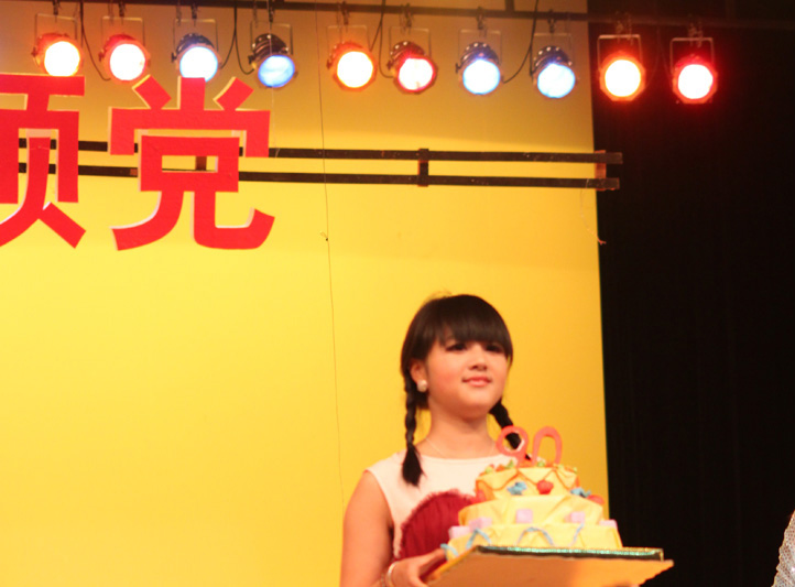 我院的朗诵节目《点燃90支蜡烛——祝党生日快乐》集合了20多位青春靓丽的大学生亮相舞台。节目开始描述一群豪情迈丈、英勇牺牲的革命烈士,随后以4人领颂和20余人群颂的形式向观众们展示,而且不光仅仅是朗诵更融入了美院的特色——书法,作为党90周年的生日礼物。节目最后还穿插有献上生日蛋糕的环节,在《生日快乐》歌声中落下帷幕,博得现场的阵阵掌声。