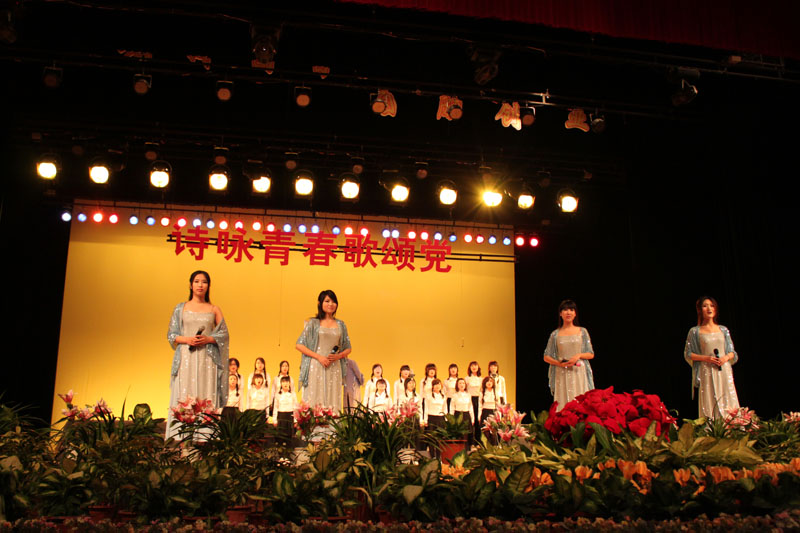 2011年4月20日晚7点,6163银河.net163.am庆祝中国共产党建党90周年诗歌朗诵会决赛在大学生活动中心演艺厅举行,6163银河.net163.am团学指导老师李剑军、学生会主席庄涛携学生会部分成员前往为我院参赛选手加油助威。 我院的朗诵节目《点燃90支蜡烛——祝党生日快乐》集合了20多位青春靓丽的大学生亮相舞台。节目开始描述一群豪情迈丈、英勇牺牲的革命烈士,随后以4人领颂和20余人群颂的形式向观众们展示,而且不光仅仅是朗诵更融入了美院的特色——书法,作为党90周年的生日礼物。节目最后还穿插有献上生日蛋糕的环节,在《生日快乐》歌声中落下帷幕,博得现场的阵阵掌声。 据悉,我院参赛选手们都十分珍惜比赛期间的每一次排练和彩排,认真对待,刻苦训练,不畏寒冷,只身穿着单薄的衣衫。无论结果怎样,这份属于自己的胜利都会牢牢印刻在每个人的心头,永不磨灭。在此,我们也祝福他们在此次比赛中取得好的成绩!祝党90岁生日快乐! 作者、摄影:戚小琴