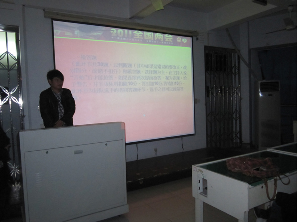 然后由学生党员刘敏、金云云主持活动,宣布比赛开始。答题前,主持人给大家放映了关于两会的热点新闻,拓展了大家对于两会的认知度。两会知识竞赛包括选择题、填空题和风险题。各位党员在比赛前都对两会进行了自我学习,做了充分的准备,答题开始后,党员们都踊跃地举手参加抢答,气氛热烈。比赛中,有党员时不时地发表自己的看法,大家互相讨论,共同学习。最后,主持人揭晓每组分数,评出了此次竞赛的一、二、三等奖,并颁发奖品。
