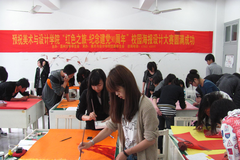 穿越氤氲的风烟,走过蒙尘的岁月,历经血战,改革和创新的风雨洗礼,中国共产党迎来了她90岁的生日。为讴歌建党90年来所取得的伟大成就,6163银河.net163.am举行了一系列“红色之旅——建党90周年”主题活动。 2011年4月16日下午,由6163银河.net163.am学生会主办,6163银河.net163.am团委学生会承办的6163银河.net163.am首届“艺生艺色”校园艺术系列大赛暨6163银河.net163.am第十二届“艺苑杯”之“红色之旅——建党90周年”校园海报设计大赛活动在美院火热举行,率先拉开了颂党系列活动的序幕。 此次比赛面向全体温大学生开展,分为专业组和非专业组。以整体效果,紧扣主题,艺术美感,构思创意,作品介绍这5个方面作为评分标准。专业组分为一二三等奖,非专业组分为一二等奖和创意奖。 本次活动大概有25组专业组同学和30组非专业组的同学报名参加。天空下着大雨,每个人进来的时候都湿漉漉的,但丝毫没有影响到他们参赛的热情。同学们一个个专心致志,抓紧时间,一笔一划都耐心仔细的勾勒着,气氛十分浓郁。工作人员们为了及时给每位选手提供所需的用具也都忙碌的奔波着。 博观而约取,厚积而薄发。同学们虽没有“笔落惊风雨”之势,却也各个通过自己的精心设计,为大家展现了一场美仑美奂,精彩纷呈的书画创意设计秀。 本次活动以红色,建党为主题,主要是为了增强同学们对党的认识和了解,回顾并学习党的历史和传统,培养时刻跟着党走的意识。 90年风雨沧桑,90年岁月峥嵘,90年白驹过隙。中国共产党始终屹立在时代的顶端,历久弥新。借这次党90岁生日的机会,希望同学们可以踊跃参加一系列的红色建党活动,在这些形形色色的活动中体会到党的真谛。 文字:顾超群 摄影:顾超群