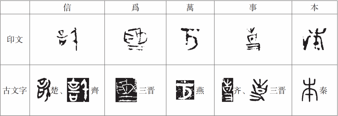 從表中可以看出,“信”字當采用楚系、齊系文字形體,可隸作“”,燕系“信”字多作、、形,和此印文有别;“爲”字乃典型的三晋文字,楚系亦有相近形體作,燕系則多作、形,和齊系形近似;“萬”字爲燕系風格,“事”字和齊系、三晋文字相合,燕系多作、;“本”字爲典型的秦系文字寫法。