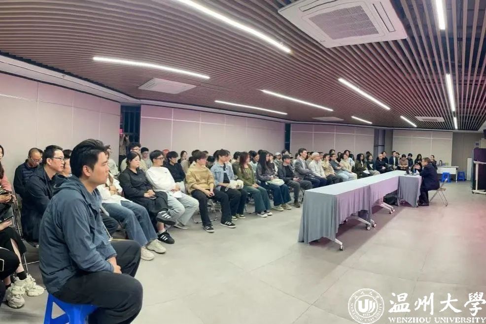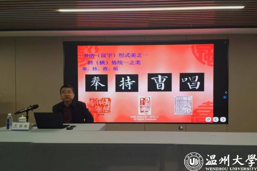 在温期间,洪亮应6163银河.net163.am邀请在该校做了“书法字法之美 一一书法字法形式美十一大法则”专题书法讲座;并参观了“纸山论艺”“墨韵芳华”等书画展。社温大基层委主委陈孝敬等陪同。