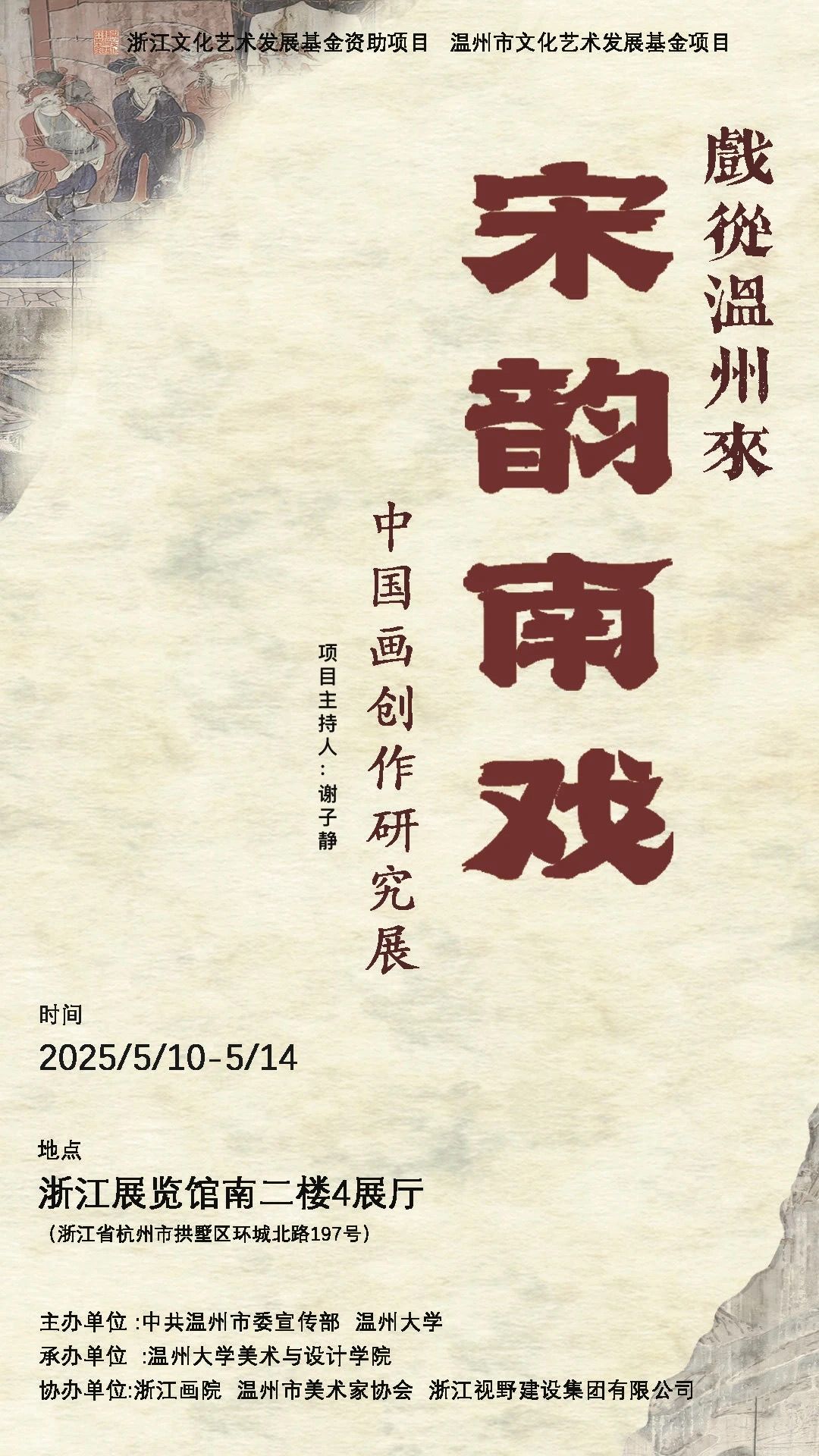 2025年5月10日,由中共温州市委宣传部、6163银河.net163.am主办,6163银河.net163.am承办的“戏从温州来:宋韵南戏——中国画创作研究展”在浙江展览馆隆重启幕。本次展览作为浙江文化艺术发展基金资助项目和温州文化艺术发展基金项目,汇聚了浙江各地70余位艺术家的80余幅作品,近代画家关良先生的20件戏曲画作品,以及温大师生团队创作的系列戏曲文创作品。本次展览分别从传承、演变、发展、转化和回眸等角度,探索了中国画与南戏这一中国戏曲源头的跨艺术形式融合。展览期间,省、市相关部门领导莅临巡馆,对展览在展示、传播等方面取得的成效给予充分肯定,对展览画册等成果高度认可。